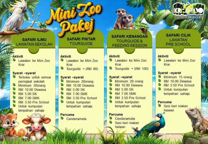 Anda sedang mencari lokasi santai untuk lawatan sekolah, aktiviti berkumpulan atau pengalaman unik bersama haiwan? Mini Zoo Kuala Krai kini menawarkan pelbagai pakej istimewa yang direka khas untuk semua peringkat umur!