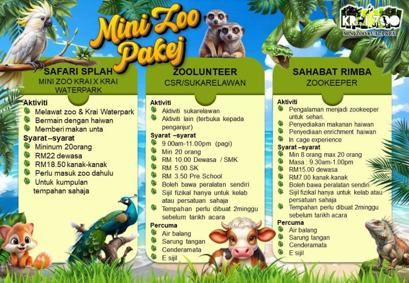 โข Zoolunteer: Pakej khas untuk aktiviti CSR atau sukarelawan (Min. 20 orang). Sertai kami menjaga kelestarian zoo!